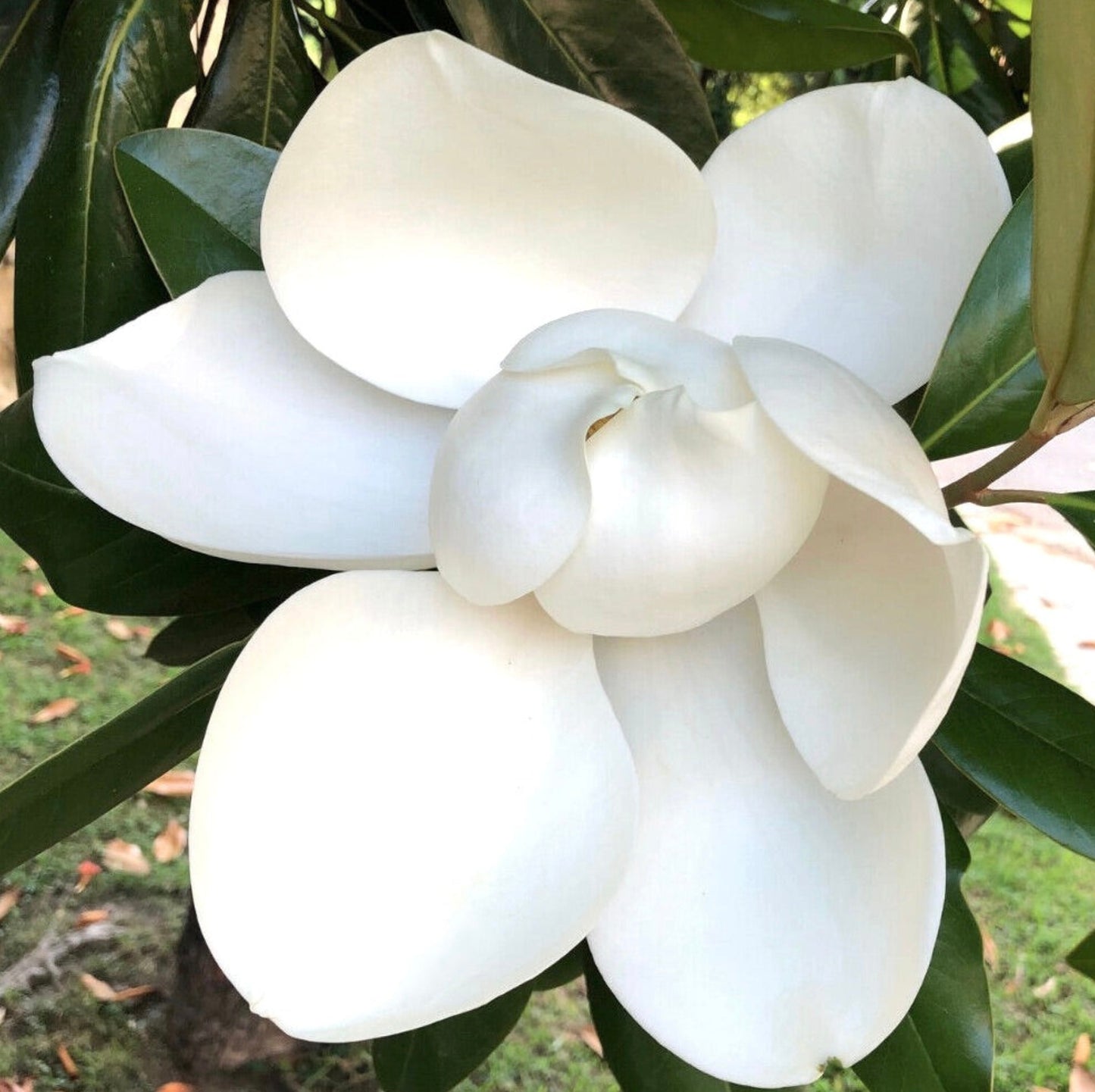 The Magnolia grandiflora is a majestic tree native to the southeastern United States. This Magnolia grandiflora tree enchants with its large white flowers that bloom beautifully against glossy, dark green leaves. People admire its strong presence and elegant form, making it a favored choice for ornamental evergreen planting in gardens and parks.