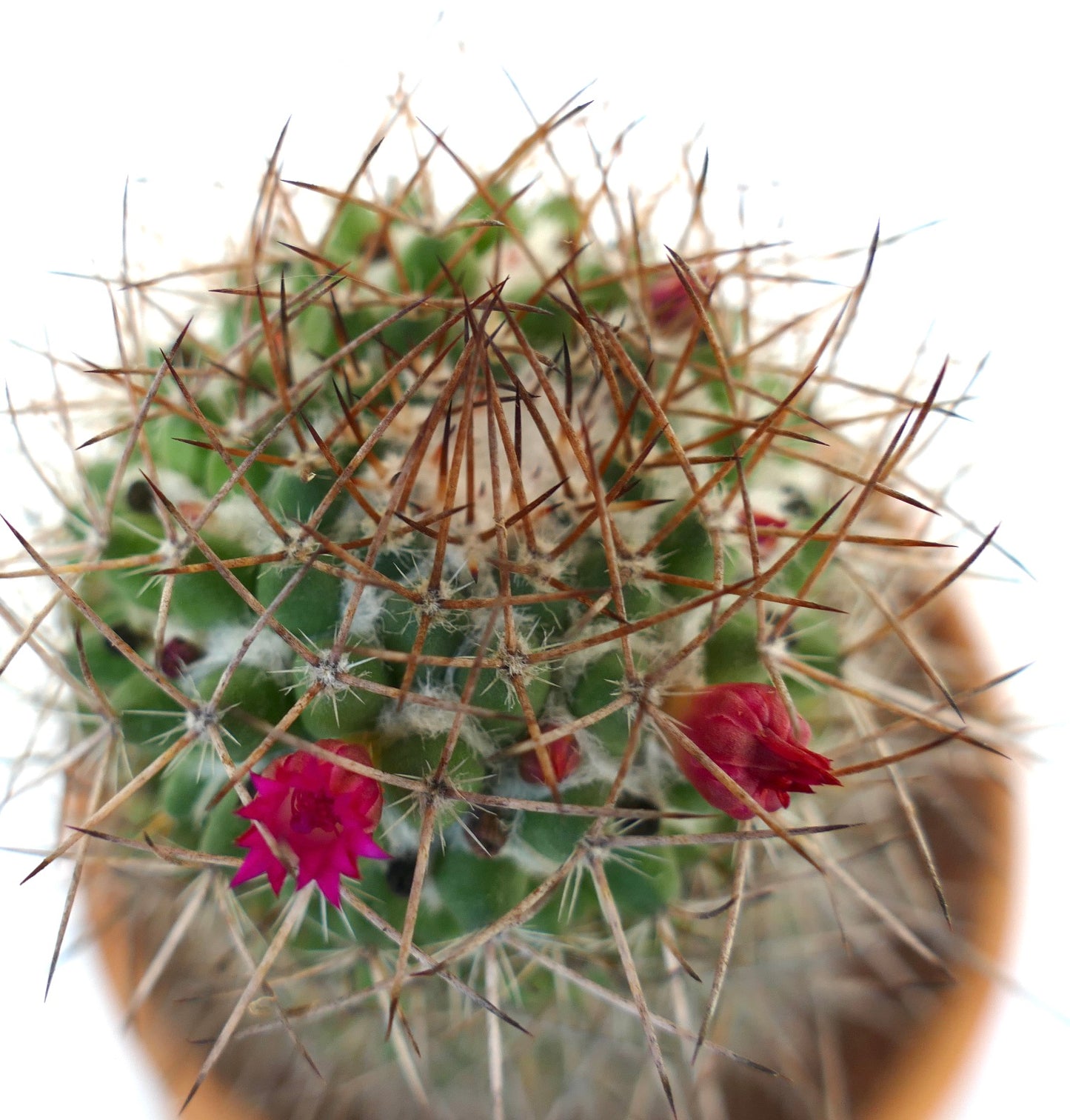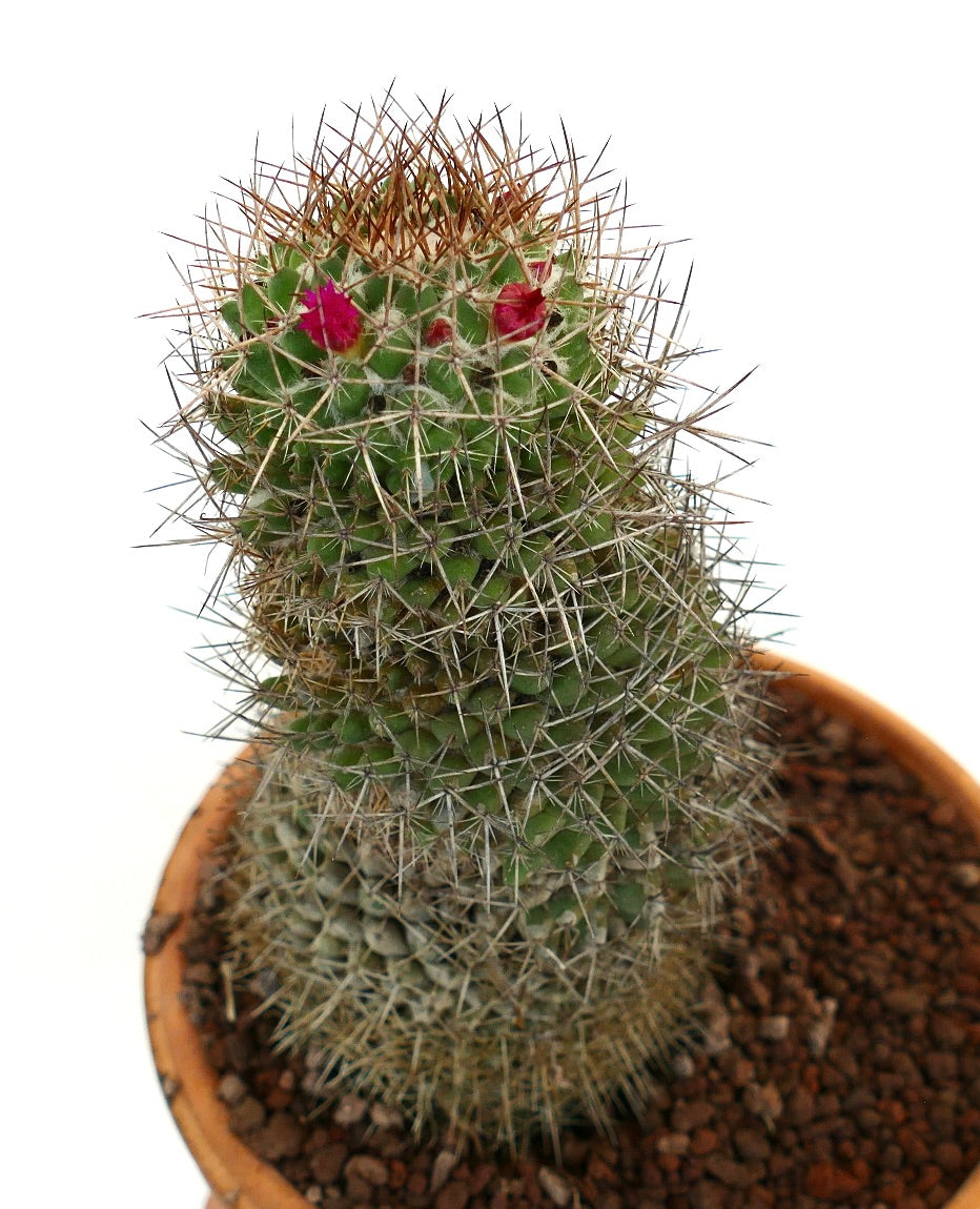 Mammillaria ingens is a notable cactus known for its large, cylindrical body, typically growing up to 20 cm in height and 10 cm in diameter. This succulent plant has numerous tubercles arranged in a neat spiral pattern, each topped with clusters of fine, white radial spines and longer central spines. The cactus produces beautiful, small pink or pale yellow flowers that encircle the crown, followed by red, berry-like fruits. Native to central Mexico, it adds a bold statement to any collection or desert landscape.