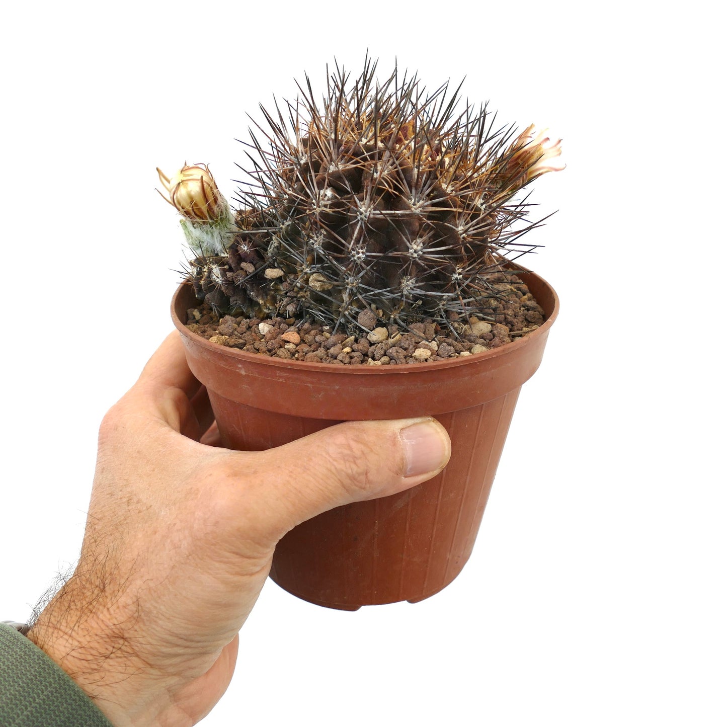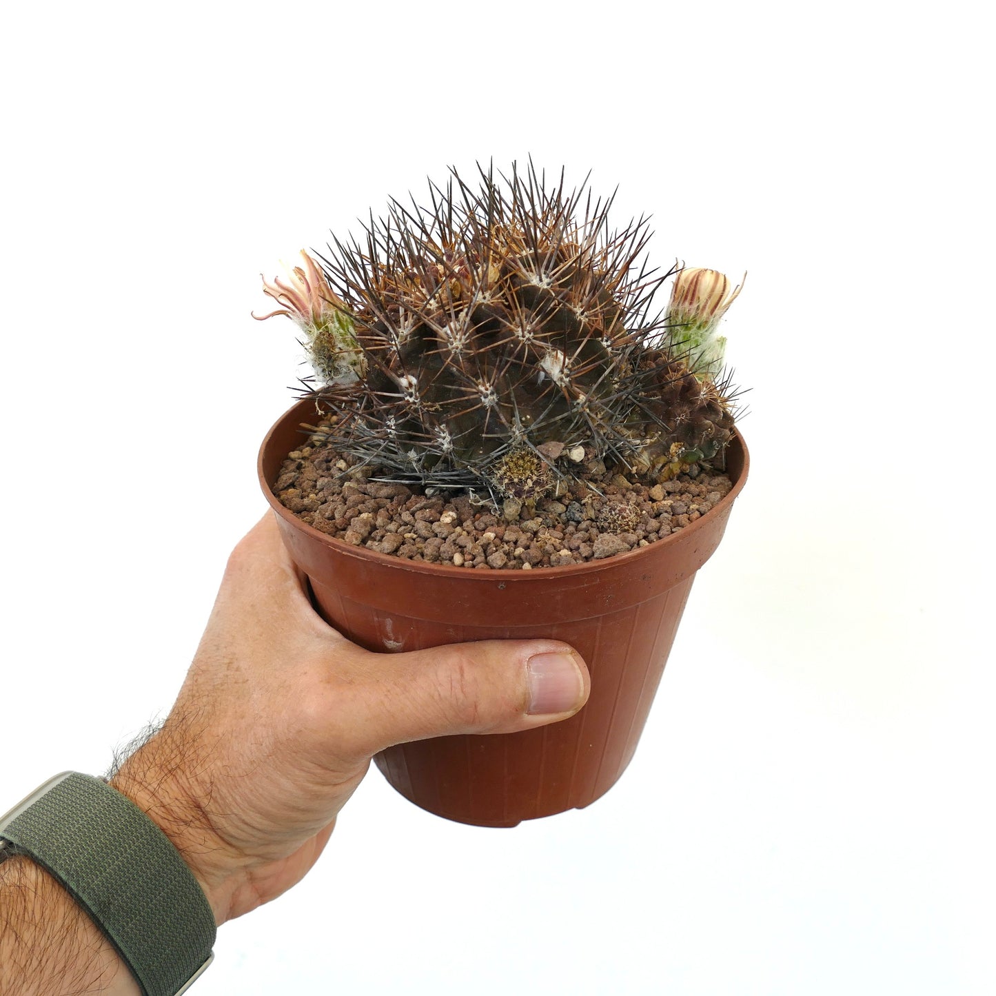 Neoporteria cachytayensis is a small, globular to cylindrical cactus native to the arid regions of northern Chile. This species typically grows solitary, featuring dark green to reddish-brown stems with prominent ribs and tubercles. The spines are short, straight, and range in color from yellowish to dark brown. The plant produces funnel-shaped flowers that are bright pink to magenta, emerging from the apex. Neoporteria cachytayensis thrives in well-draining, sandy to rocky soils and requires full sun. It is highly drought-tolerant but benefits from occasional watering during the growing season.