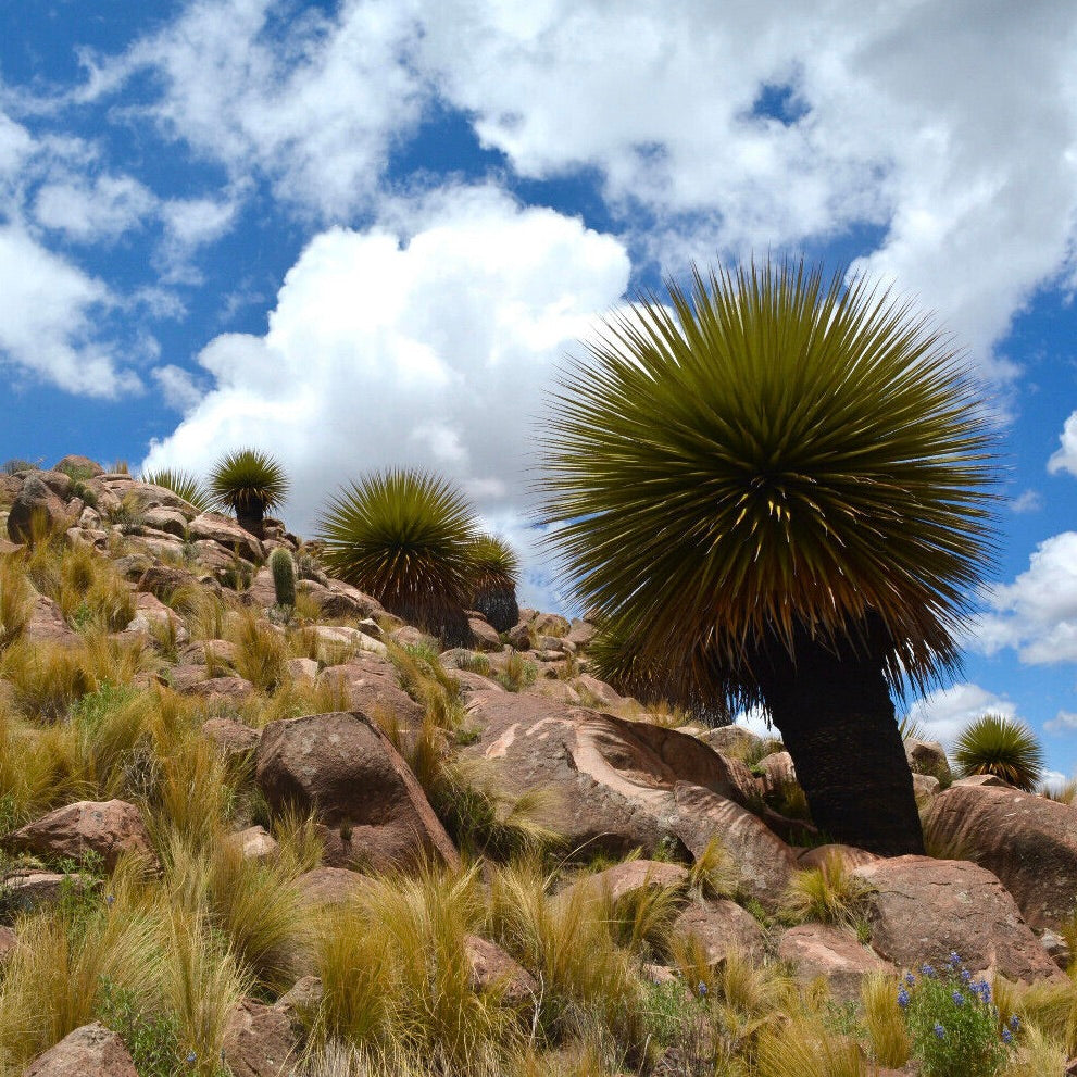Puya raimondii, also known as the Queen of the Andes, is a giant terrestrial bromeliad native to the high-altitude regions of Peru and Bolivia. This monumental plant can grow up to 3 meters (10 feet) in height, forming a dense rosette of long, narrow, spiny leaves. After several decades, it produces a towering flower spike, reaching up to 10 meters (33 feet) tall, covered in thousands of creamy-white blooms that attract pollinators. As a slow-growing, monocarpic species, it flowers only once before dying, making each bloom a rare and spectacular event.