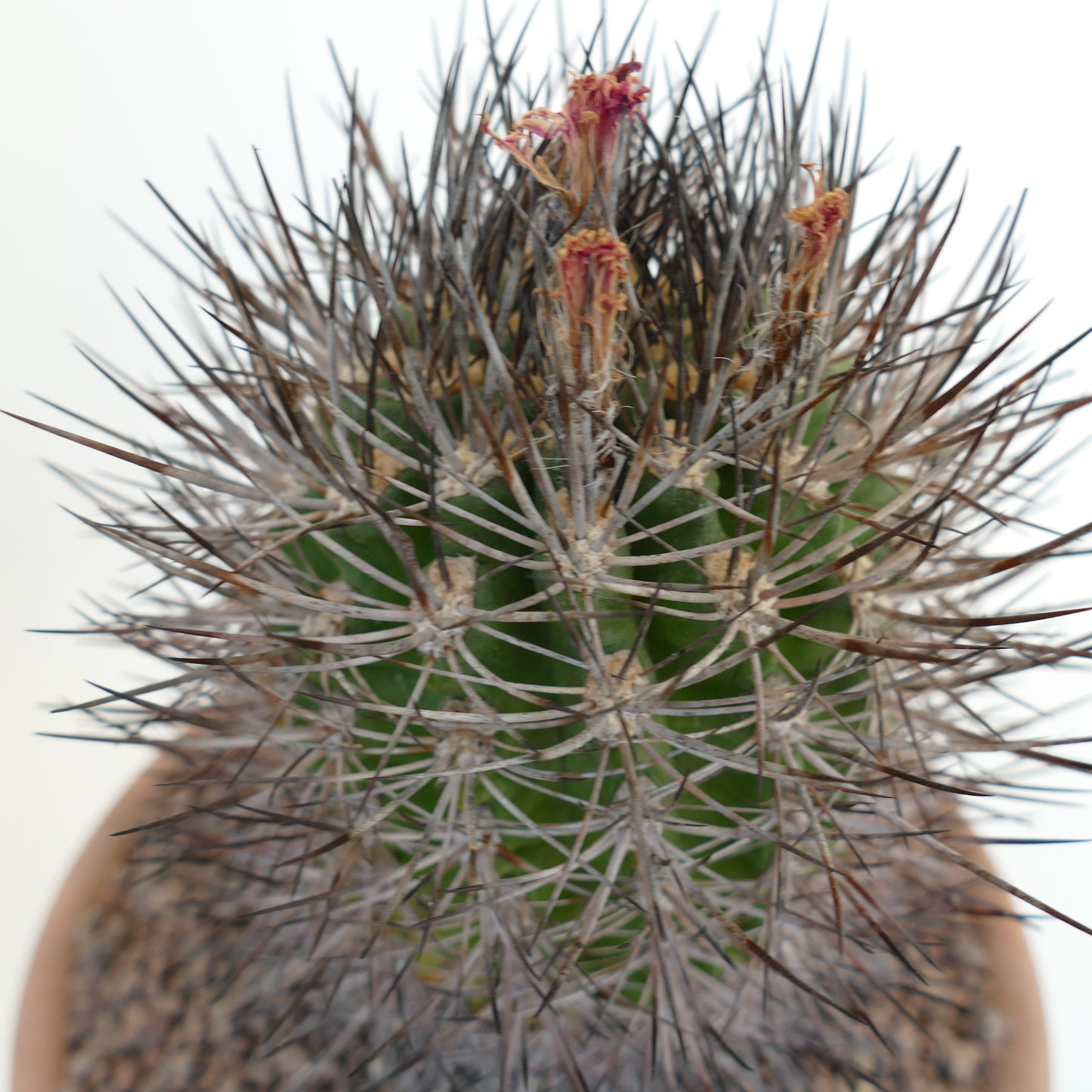 Pyrrhocactus confinis, also known as Eriosyce confinis, is a small, globular to slightly cylindrical cactus native to the Baranquilla region in Chile. This cactus typically grows solitary, featuring a dark green to bluish-green stem with pronounced ribs and tubercles. The spines are straight and stiff, varying in color from yellow to dark brown. Pyrrhocactus confinis produces funnel-shaped flowers that are bright yellow, emerging from the apex. This species thrives in well-draining, sandy to rocky soils and requires full sun. It is highly drought-tolerant but benefits from occasional watering during the growing season.