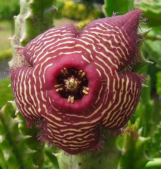 The Stapelia revoluta var. tigrida is a captivating succulent known for its striking tiger-striped blooms. This Stapelia revoluta var. tigrida unrooted cutting offers a unique chance to grow a plant famous for its star-shaped flowers. People often call it the carrion flower because its large, textured petals resemble a starfish and emit a distinct scent. Native to South Africa, this variety adds exotic appeal to any collection.