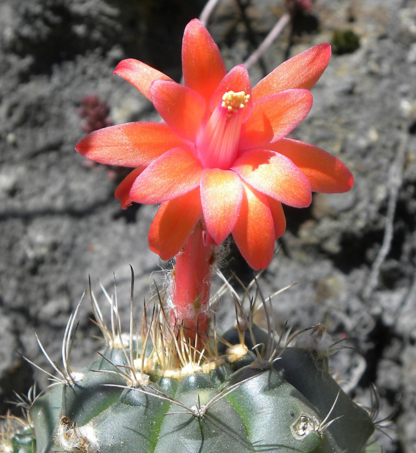 Submatucana paucicostata is a rare and compact cactus species originating from the high-altitude regions of Peru. This small, globular cactus is characterized by its few prominent ribs (hence the name “paucicostata,” meaning “few ribs”) and short, woolly areoles that may occasionally produce tiny spines. The body is a rich dark green, and in spring and summer, it blooms with large, funnel-shaped orange-red flowers that add a striking contrast to its small stature. Growing this cactus from seeds can be an exciting challenge, as the seedlings develop into a sculptural, ribbed form over time.