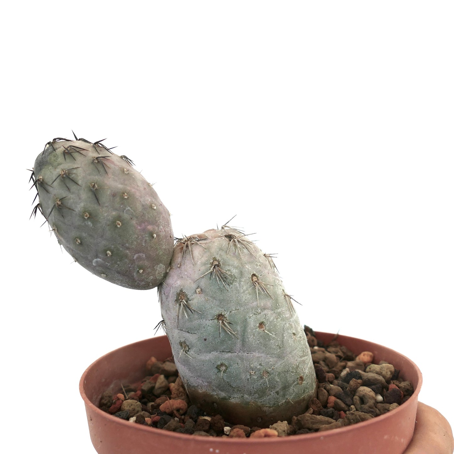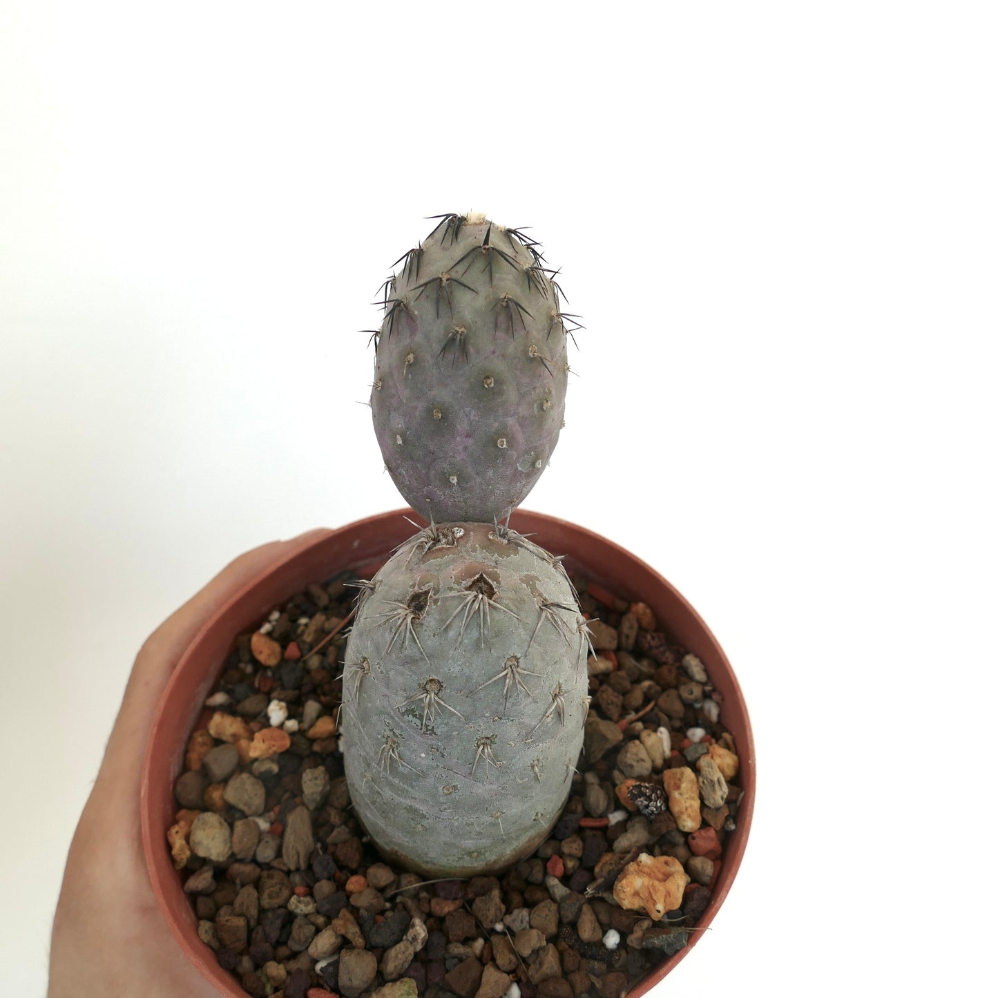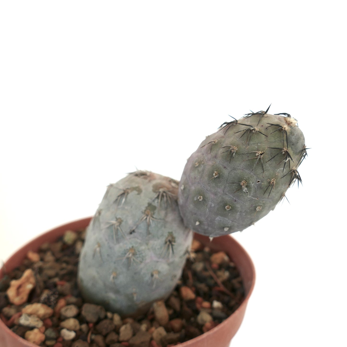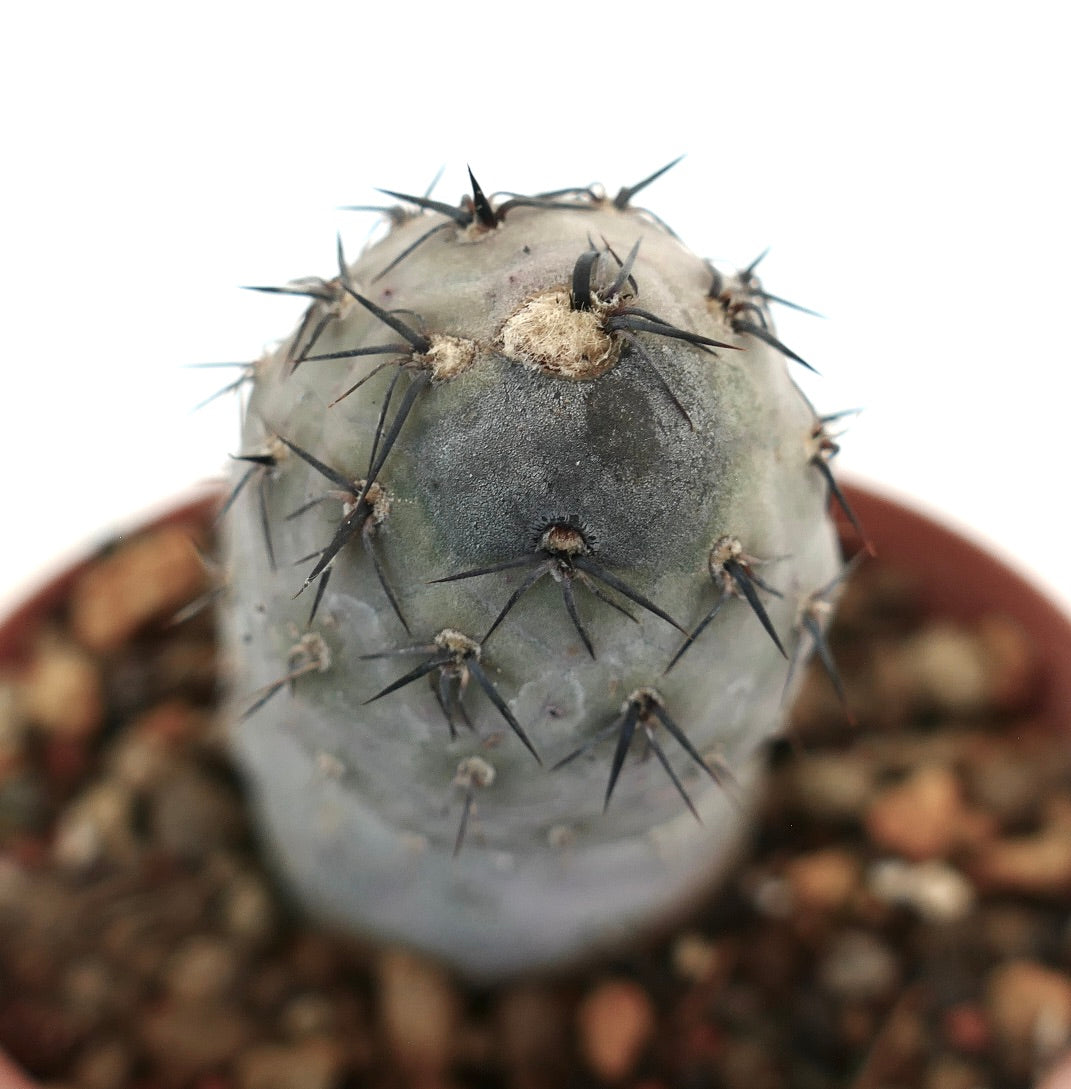 Tephrocactus geometricus BLACK SPINES is a unique and eye-catching cactus known for its geometric, spherical segments. Each segment is globular, typically bluish-green, and can reach up to 2 inches in diameter. The segments have a smooth surface and are adorned with small, sparse areoles that may produce tiny spines or glochids. This cactus grows in a clumping form, creating an intriguing sculptural appearance. During the spring, it produces beautiful, pale yellow to white flowers, adding to its ornamental value. Tephrocactus geometricus is a hardy plant, well-suited to both indoor and outdoor cultivation in xeric conditions.