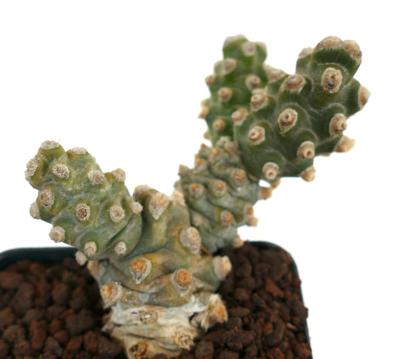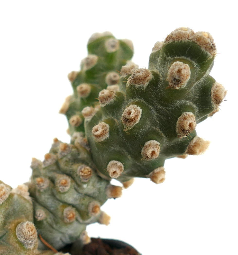 Tephrocactus molinensis is a unique cactus with a distinctive appearance. Its stem segments are globular or cylindrical, often resembling a stack of stones. These segments are covered in short spines that can vary in color from white to brown. The plant produces white to pale yellow flowers that bloom near the tips of the segments, adding to its visual appeal. Its compact size makes it ideal for rock gardens or potted displays. This cactus is known for its ability to thrive in arid environments and requires minimal maintenance.