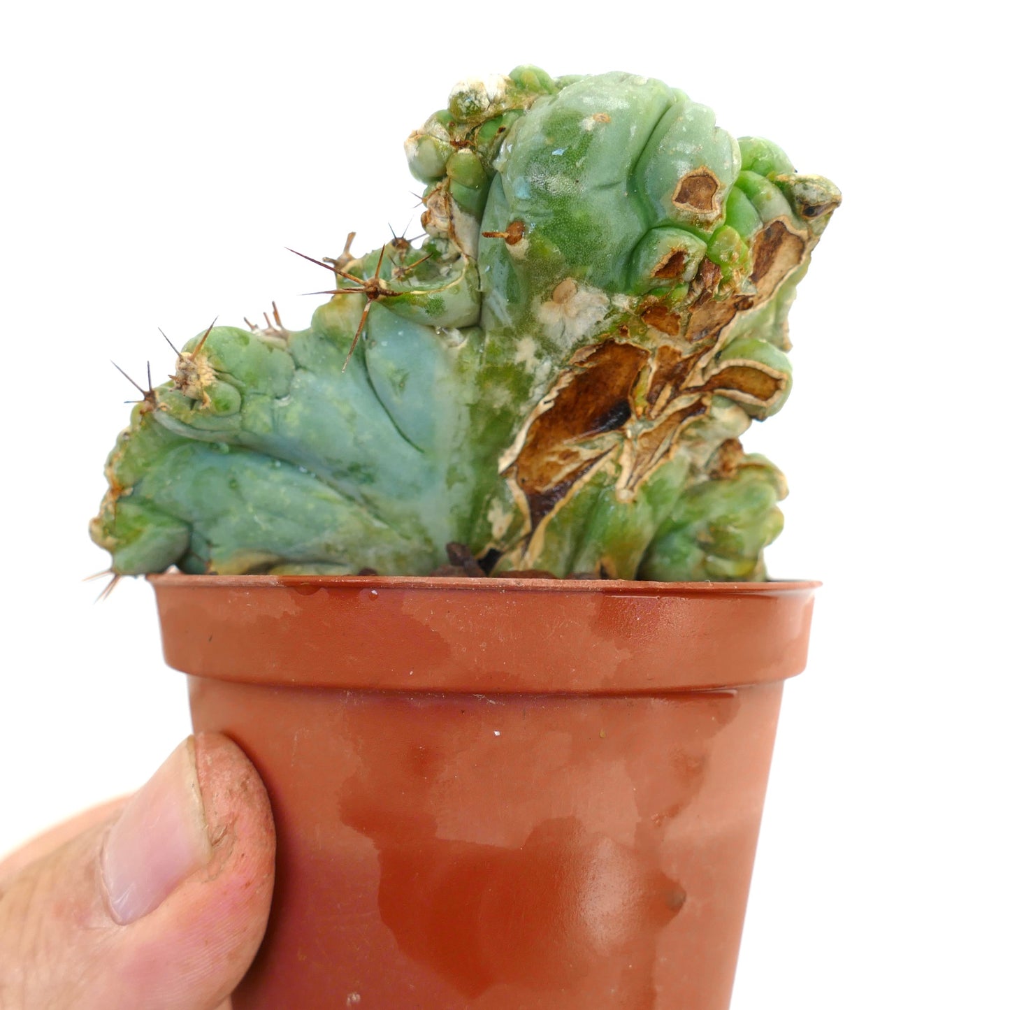 Trichocereus pachanoi MONSTRUOSUS, commonly known as the Monstrose San Pedro Cactus, is a fascinating variant of the traditional San Pedro cactus. This succulent features a unique, irregular growth pattern with knobby, undulating stems that give it a sculptural appearance. Its skin is a vivid green and may have short, sparse spines. In late spring to summer, it can produce large, white, fragrant flowers that open at night. This cactus is often sought after for its ornamental value and ease of care, making it a stunning addition to any succulent collection.