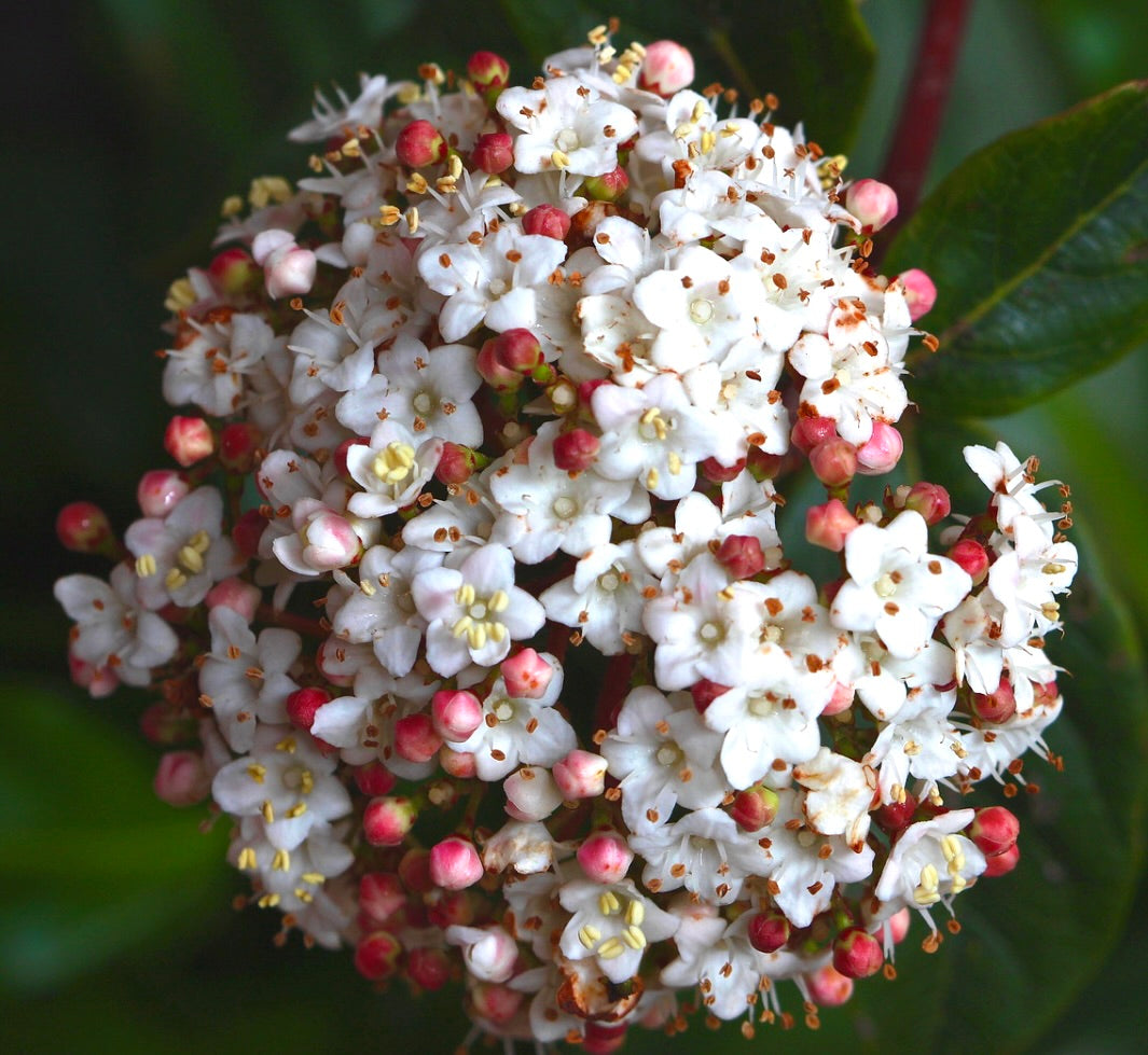 Gardeners value Viburnum tinus for its long blooming season, which can span from autumn through spring. The contrast between the deep foliage and the bright flowers is striking, especially when enhanced by its metallic blue-black berries that appear after flowering. This dual seasonal show of blooms and fruit makes it a sculptural, living element in both formal and wild garden designs. Its compact shape is ideal for hedging, containers, or as a standalone feature.